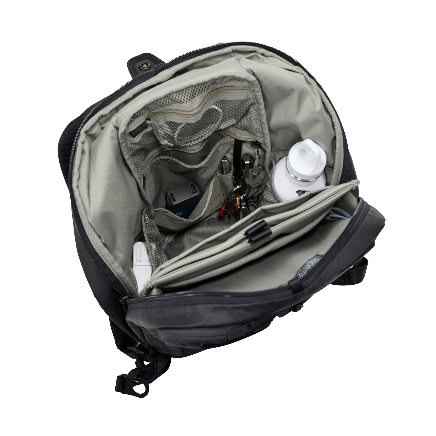 - Organizirajte malu elektroniku i dodatnu opremu te ih sve držite na dohvat ruke s pomoću više unutarnjih džepova, ploče za organizaciju malih elektroničkih uređaja i kuke za privjesak za ključeve